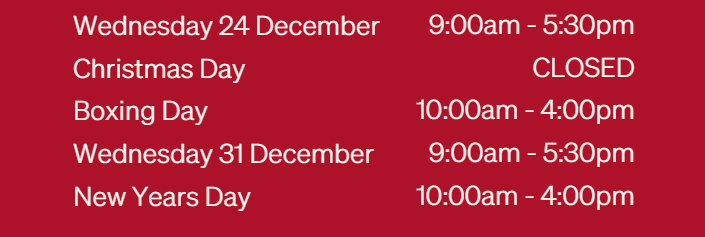 Fri 26 Dec (Boxing Day): 9:00 AM – 6:00 PM